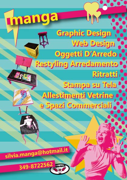 Manga Lab è un laboratorio creativo dove si mescolano Graphic Design, Decorazione di interni, Oggetti di arredo, Restyling, Ritratti, Stampe su tela e su supporti rigidi, Allestimenti vetrine e spazi commerciali con lo scopo di personalizzare i vostri ambienti e rendere possibile la realizzazione delle vostre idee.